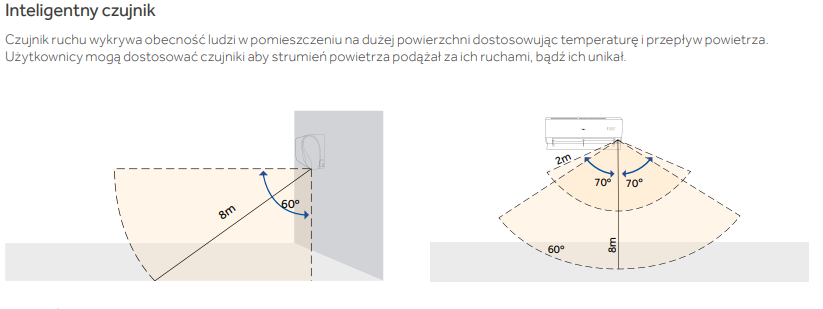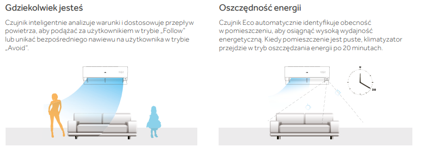 Automatyczne sterowanie i kontrolowanie pracy klimatyzatora w rzeczywistym czasie z czujnikiem obecności. Klimatyzator na podstawie odczytów z wbudowanych czujników minimalizuje zużycie energii elektrycznej oraz polepsza komfort użytkowników