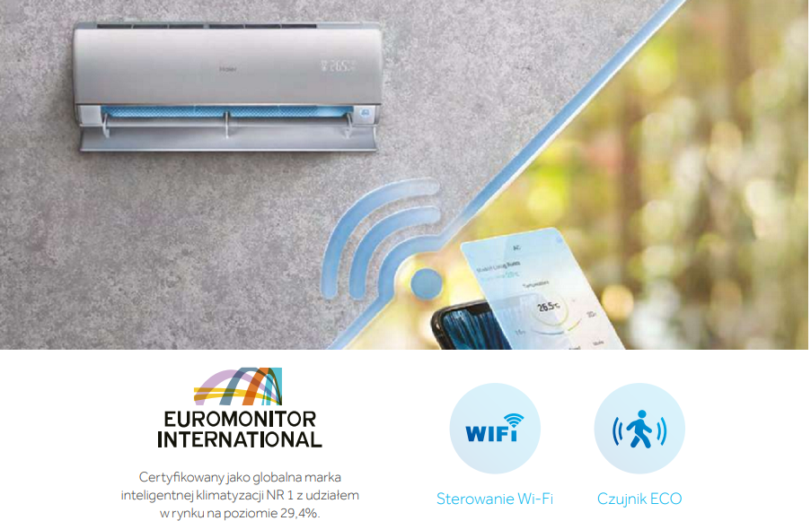 Szybki rozwój technologii komunikacyjnej w ostatnich latach pozwolił na wprowadzenie funkcji ułatwiających korzystanie z urządzeń. Klimatyzatory Haier mogą być sterowane za pomocą telefonu lub tabletu podłączonego do sieci internetowej. Dzięki inteligentnym funkcjom możesz dostosować klimatyzator do swoich potrzeb, z dowolnego miejsca i o każdej porze. Klimatyzatory Haier są sprzedawane do ponad 130 krajów i regionów, z wynikiem sprzedażowym przekraczającym 25 mln jednostek na całym świecie. W lutym 2020 roku, Haier został globalną marką inteligentnej klimatyzacji NR 1 z udziałem w rynku na poziomie 29,4%.