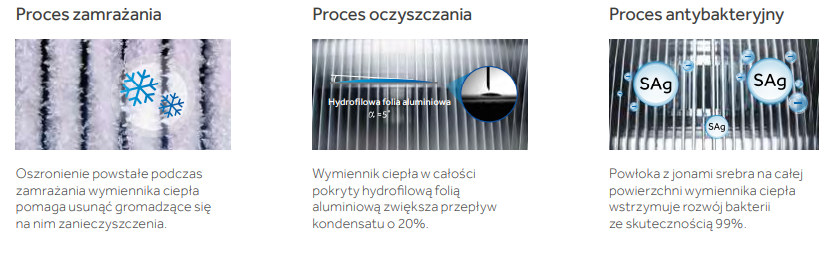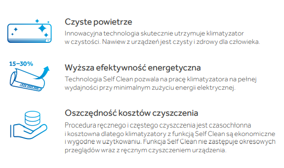 Technologia samooczyszczania urządzenia. Funkcja samoczyszcząca Self Clean, pozwala na sprawniejsze i wygodniejsze użytkowanie urządzenia – wilgotne powietrze zamraża powierzchnię wymiennika ciepła klimatyzatora (j. wew.) i usuwa zanieczyszczenia w momencie rozmrażania.