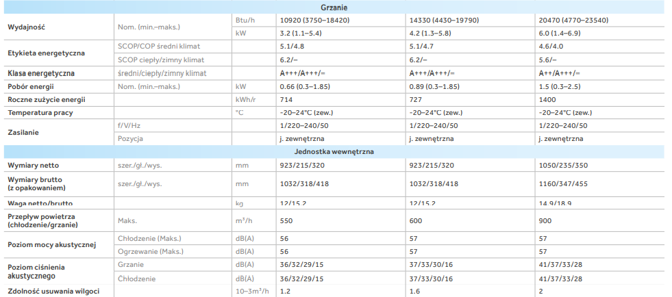 | Poziom ciśnienia akustycznego jednostki wewnętrznej dla chłodzenia min./maks. (dBA) | 28 / 41 |