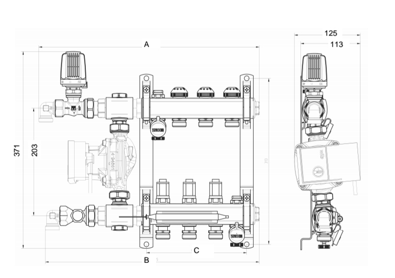 Stacja regulacyjna do ogrzewania podłogowego, przyłącze z lewej strony.