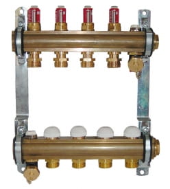 Zespół rozdzielacza drążkowego z przepływomierzami składa się z rozdzielacza na powrocie z wkładkami termostatycznymi i rozdzielacza na zasilaniu z wkładkami regulacyjnymi przepływomierzy ze wskaźnikiem przepływu, odpowietrzenia, spustu z przyłączem do węża, kołpaków końcowych i uchwytów.