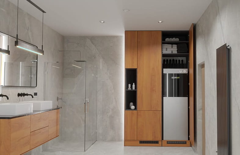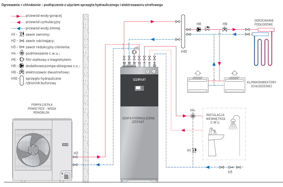 Szafy hydrauliczne iZZiFAST współpracujące z pompami ciepła powietrze-woda typu monoblok to urządzenia zawierające w swojej kompaktowej obudowie o powierzchni 0,4 m² wszystkie niezbędne elementy standardowej kotłowni wraz z zasobnikiem ciepła oraz armaturą hydrauliczną i sterującą niezbędną do prawidłowego i bezpiecznego funkcjonowania instalacji centralnego ogrzewania (CO) oraz ciepłej wody (CWU) w budynku.