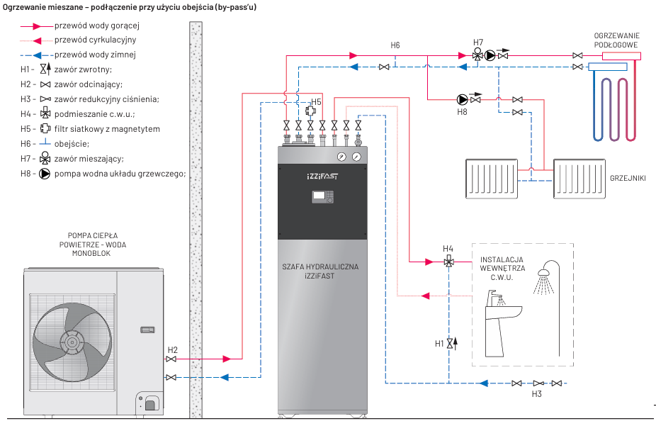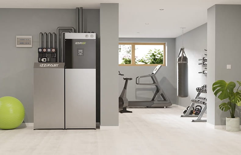 Szafy hydrauliczne iZZiFAST współpracujące z pompami ciepła powietrze-woda typu monoblok to urządzenia zawierające w swojej kompaktowej obudowie o powierzchni 0,4 m² wszystkie niezbędne elementy standardowej kotłowni wraz z zasobnikiem ciepła oraz armaturą hydrauliczną i sterującą niezbędną do prawidłowego i bezpiecznego funkcjonowania instalacji centralnego ogrzewania (CO) oraz ciepłej wody (CWU) w budynku.