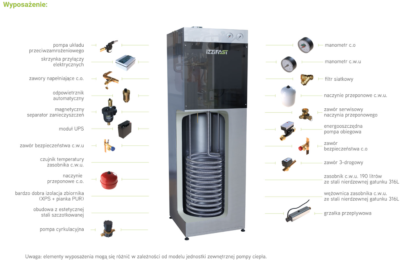 Szafy hydrauliczne iZZiFAST współpracujące z pompami ciepła powietrze-woda typu monoblok to urządzenia zawierające w swojej kompaktowej obudowie o powierzchni 0,4 m² wszystkie niezbędne elementy standardowej kotłowni wraz z zasobnikiem ciepła oraz armaturą hydrauliczną i sterującą niezbędną do prawidłowego i bezpiecznego funkcjonowania instalacji centralnego ogrzewania (CO) oraz ciepłej wody (CWU) w budynku.
