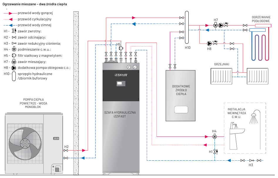 Szafy hydrauliczne iZZiFAST współpracujące z pompami ciepła powietrze-woda typu monoblok to urządzenia zawierające w swojej kompaktowej obudowie o powierzchni 0,4 m² wszystkie niezbędne elementy standardowej kotłowni wraz z zasobnikiem ciepła oraz armaturą hydrauliczną i sterującą niezbędną do prawidłowego i bezpiecznego funkcjonowania instalacji centralnego ogrzewania (CO) oraz ciepłej wody (CWU) w budynku.