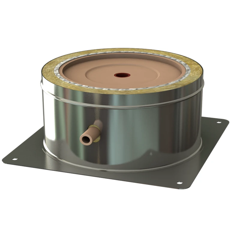 Odskraplacz systemu Cerastal z odpływem w bok, w komplecie z płytą podstawy. Płaszcz wewnętrzny: ceramika izostatyczna; izolacja glinokrzemianowa; płaszcz zewnętrzny z blachy nierdzewnej 0,6mm; płyta z blachy nierdzewnej 1,5mm; dostępne średnice płaszcza wewnętrznego: 120, 140, 160, 180, 200, 250mm;