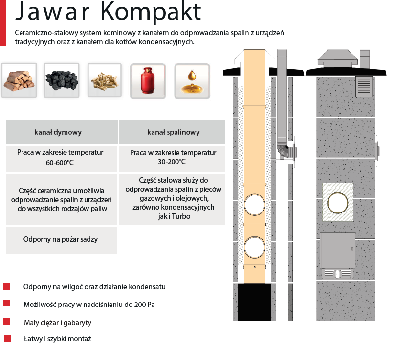 KOMPLETNY KOMIN JAWAR KOMPAKT Z KANAŁEM DO ODPROWADZANIA SPALIN Z URZĄDZEŃ TRADYCYJNYCH ORAZ KANAŁEM DLA KOTŁÓW KONDENSACYJNYCH