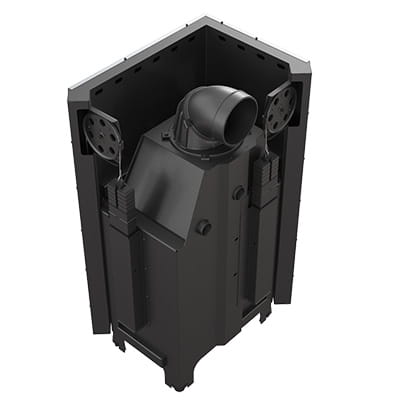 Potrójny system dopowietrzenia komory spalania: powietrze pierwotne - skierowane jest na płytę, na której odbywa się spalanie; powietrze wtórne dostarczane jest otworami w tylnej ścianie. Dodatkowo we wkładzie zastosowany jest system czystej szyby (kurtyna powietrza).