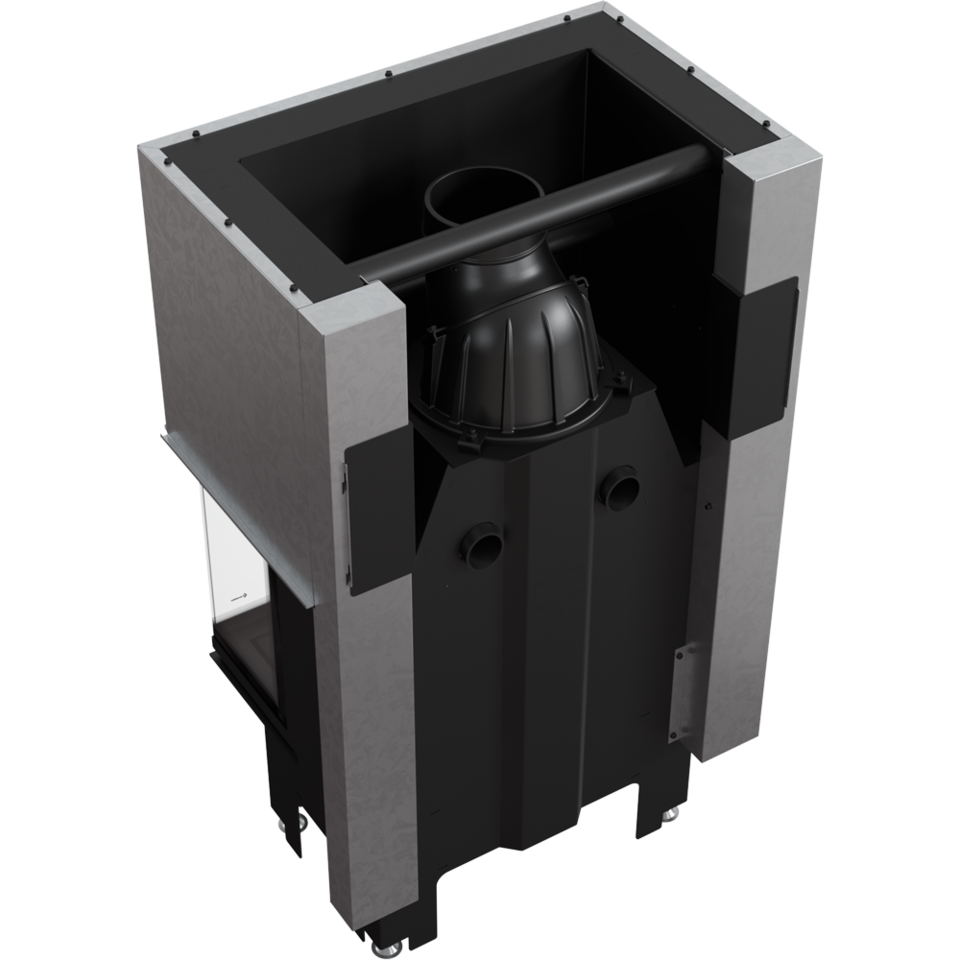 Efektywniejsze spalanie i dłuższe utrzymywanie temperatury następuje dzięki wyłożeniu komory spalania Acumotte, materiałem akumulującym ciepło, który podwyższa temperaturę w palenisku. Dodatkowo jego gładka, biała powierzchnia efektownie prezentuje się wewnątrz kominka.