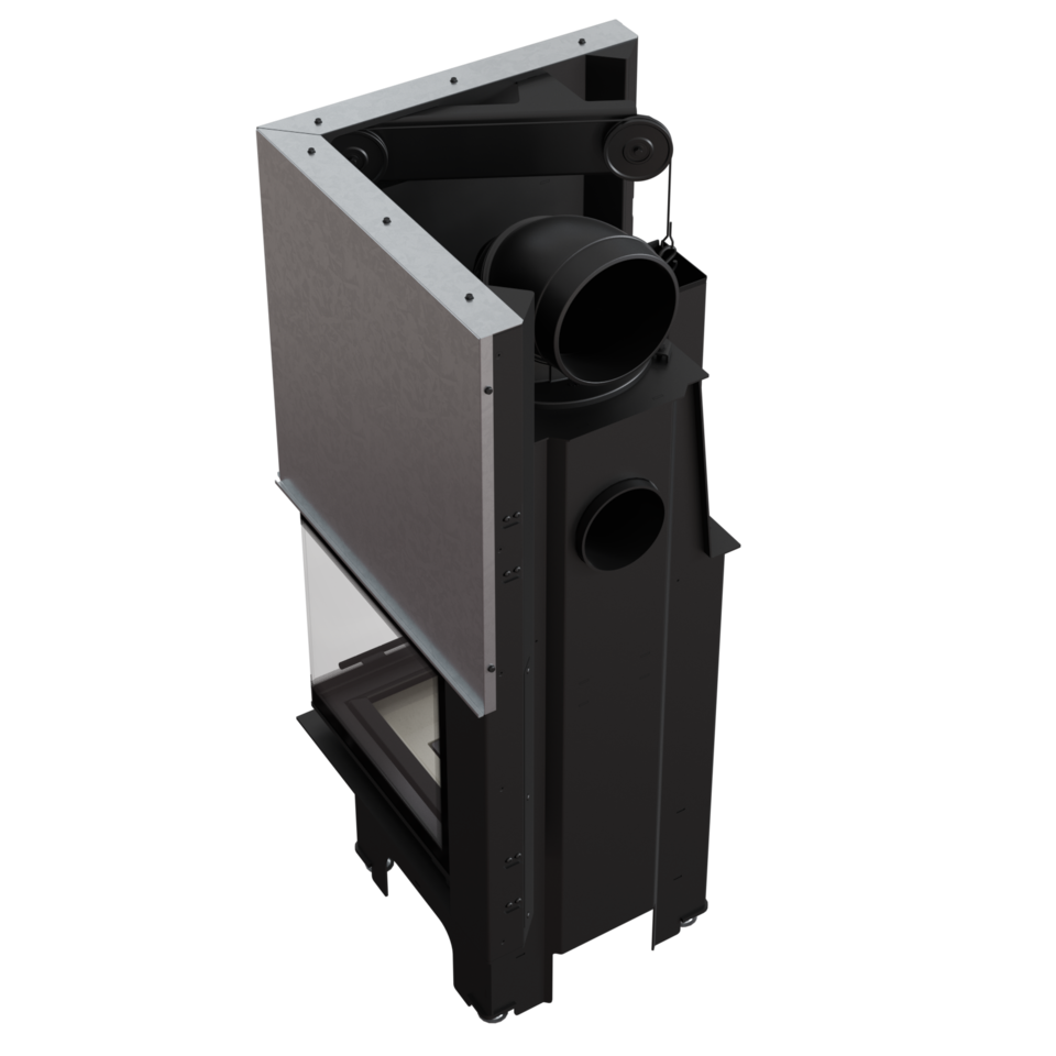 Drzwi wkładu pracują w systemie lift up - szyba unoszona do góry. System ten został zbudowany w oparciu o przeciwwagę - bloczek z linką stalową pracuje w prowadnicach na dwóch łożyskowanych krążkach, dzięki którym ciężar drzwi rozkłada się równomiernie. Poruszają się one na ogniotrwałych łożyskach wzdłuż, zamontowanych w futrynie prowadnic ślizgowych, co gwarantuje ich lekką, cichą i bezawaryjną pracę. Ruch drzwiczek przebiega w odległości paru milimetrów od korpusu, co zapobiega uszkodzeniu uszczelnienia. Zamykane drzwi są wtłaczane z dużą siłą w głąb futryny, dzięki czemu palenisko jest całkowicie szczelne.