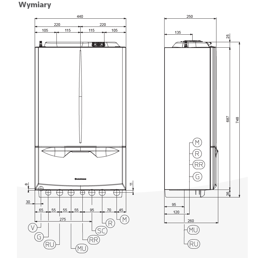 | Wymiary kotła wys x szer x głęb (mm) | 748x440x250 |