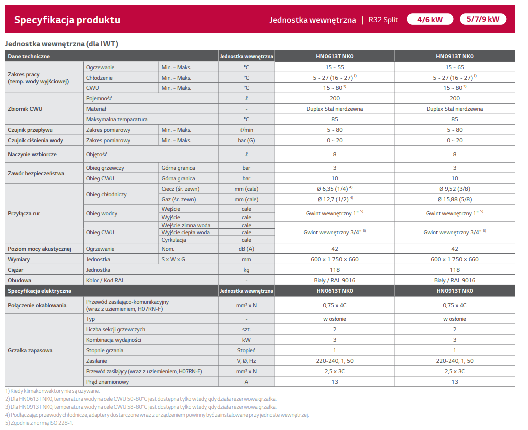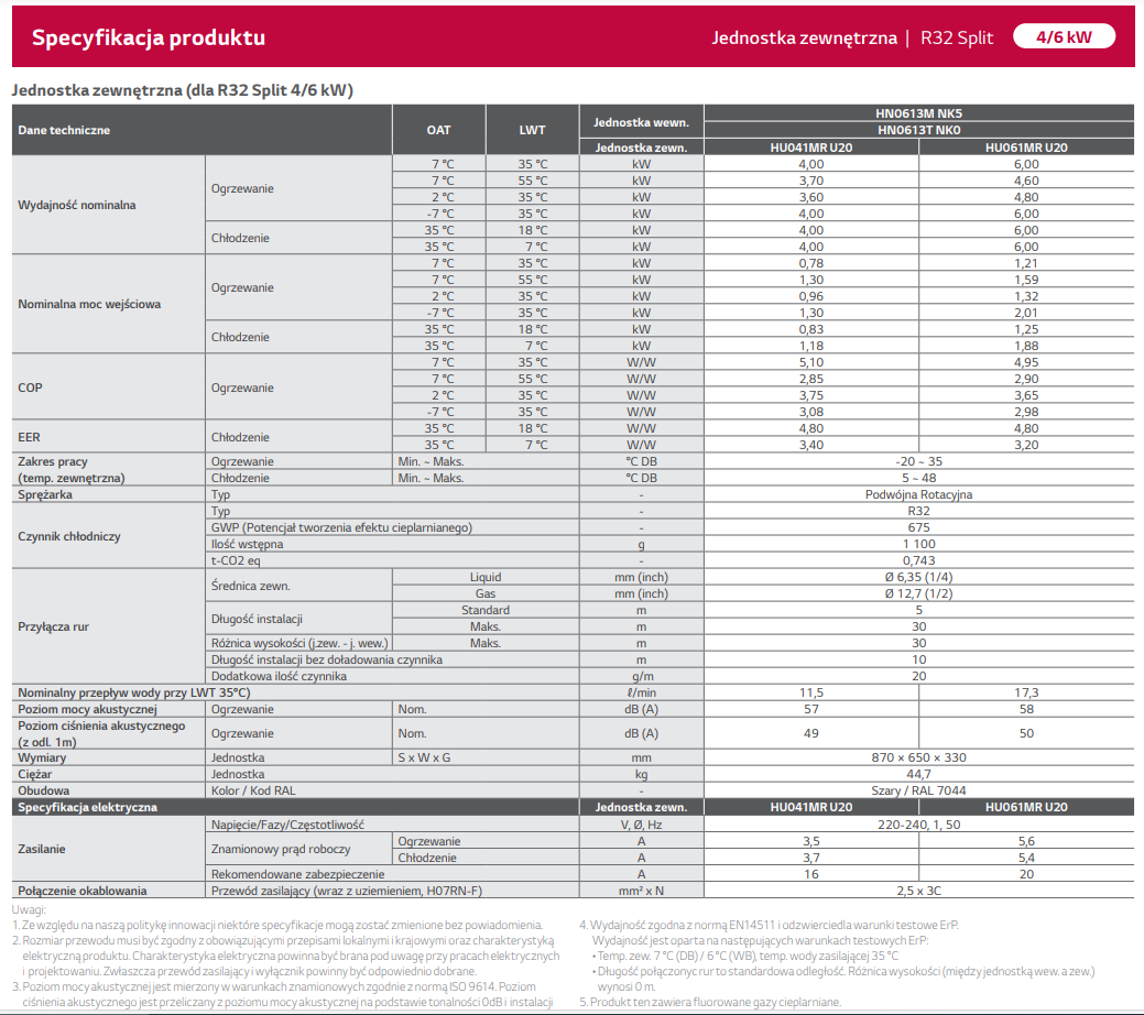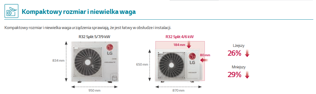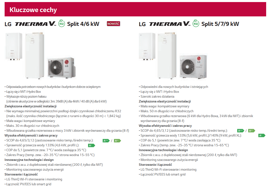 Seria LG THERMA V R32 Split to pompa ciepła typu powietrze-woda, składająca się z jednostki zewnętrznej i wewnętrznej, które połączone są przewodami czynnika chłodniczego. Kombinacje dostępne są w dwóch różnych wersjach: Hydrobox lub ze zintegrowanym zbiornikiem c.w.u. w zależności od konkretnych potrzeb nieruchomości. Jednostka zewnętrzna jest oferowana w wersjach 4/6 kW i 5/7/9 kW. Model R32 Split 4/6 kW jest odpowiedni dla nowo wybudowanych domów, które są dobrze ocieplone i wymagają małego obciążenia cieplnego, podczas gdy model R32 Split 5/7/9 kW jest przystosowany zarówno do nowych projektów budowlanych, jak i do już istniejących budynków.