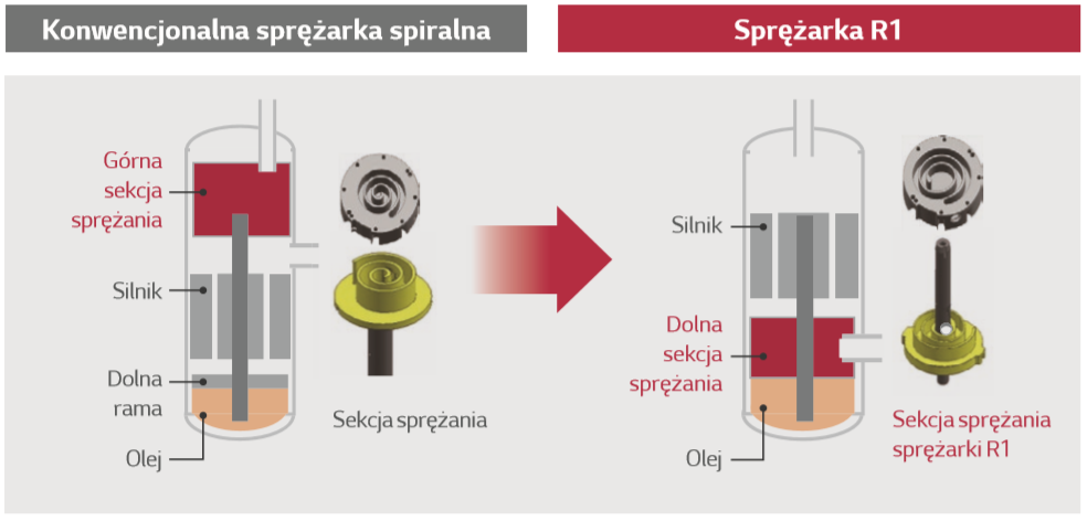 R1 COMPRESSOR jest pierwszą na świecie hybrydową sprężarką spiralną z bezpośrednim przeniesieniem napędu. Wykorzystując najlepsze elementy sprężarek spiralnych i rotacyjnych, sprężarka R1 zapewnia znakomitą wydajność i efektywność oraz pozwala na ich wyraźną poprawę w zakresie pracy. Innowacyjna technologia LG eliminuje ruch przechylania się zespołu, minimalizując straty energii i zwiększając ogólną niezawodność. Oto najważniejsze cechy hybrydowej sprężarki spiralnej LG: