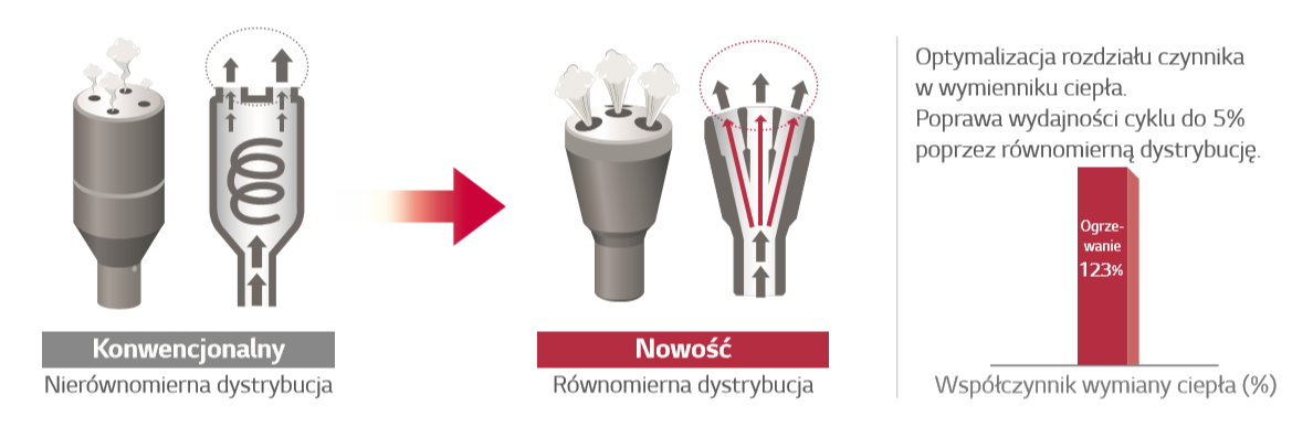 Efektywność i wydajność zostały poprawione poprzez zwiększenie stopnia wymiany ciepła przez szerokie użebrowanie i nową, zoptymalizowaną konstrukcję rozdzielacza w wymienniku ciepła.
