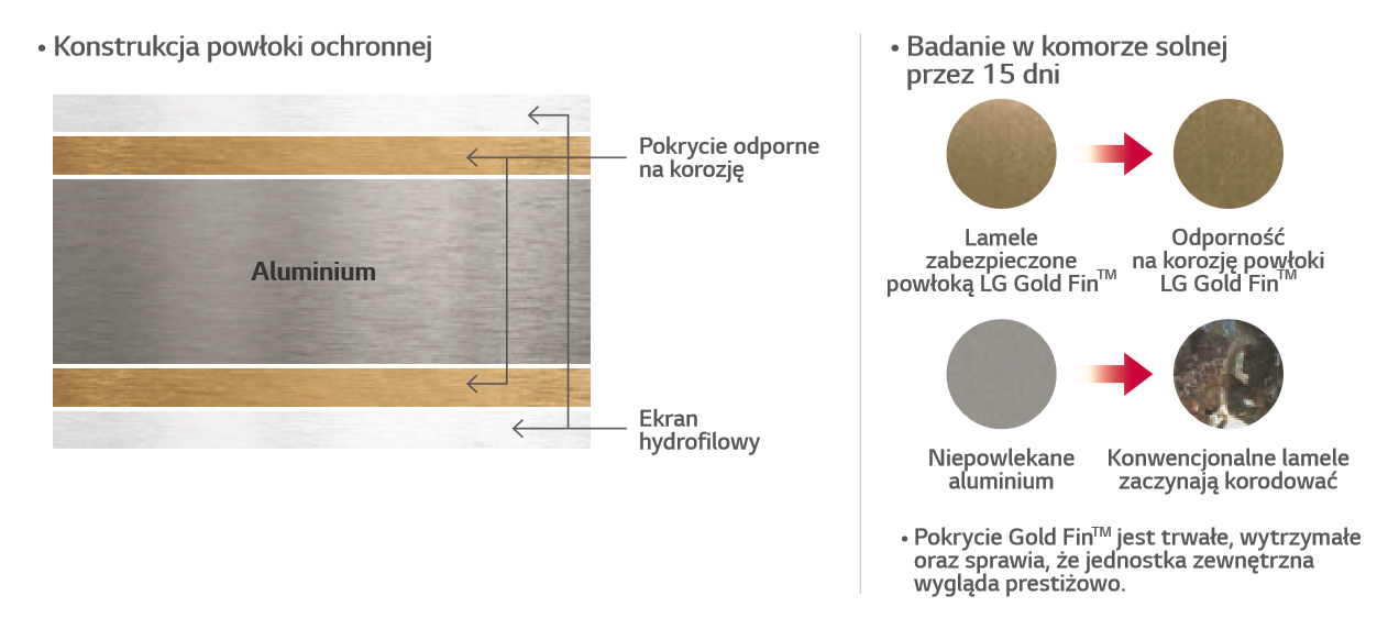 W celu ochrony przed korozją, aluminiowe lamele zewnętrznego wymiennika ciepła LG pokryte są epoksydową powłoką antykorozyjną o złotym kolorze. To sprawia, że utrzymuje ona przez dłuższy czas doskonałe własności przewodzenia ciepła, natomiast brak pokrycia Gold Fin™ powoduje stopniową utratę wydajność na skutek korozji powierzchniowej. Rozwiązanie Gold Fin™ jest idealne na obszarach o wysokim zanieczyszczeniu powietrza lub w miejscach narażonych na morską mgłę solną.