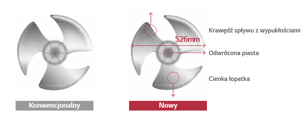 Nowy wentylator posiada łopatkę wąską u nasady oraz krawędź spływu z wypukłościami, co zapewnia większą wydajność, niski poziom hałasu oraz poprawę wydajności przepływu powietrza.