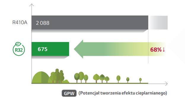 - Czynnik R32 posiada mniejszy potencjał tworzenia efektu cieplarnianego