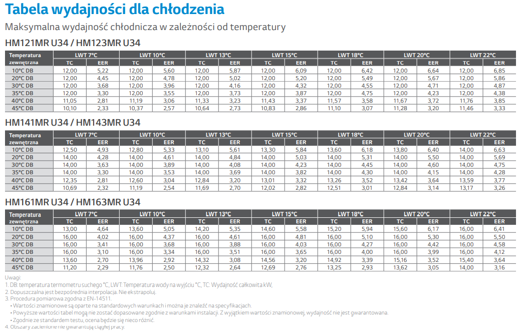 - 100% wydajności trybie grzania przy temperaturze zewnętrznej -15°C (średnia temp. wody na wyjściu 35°C , z wyjątkiem modelu o mocy 16kW)