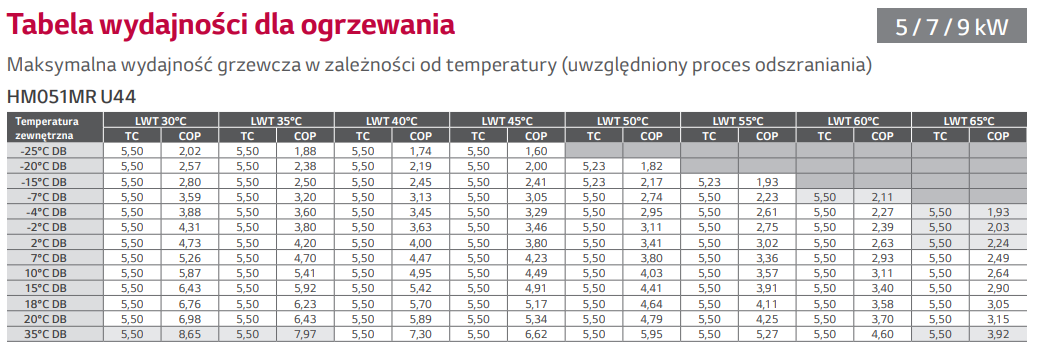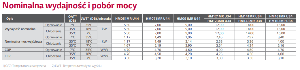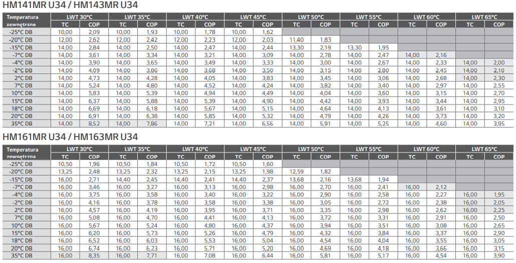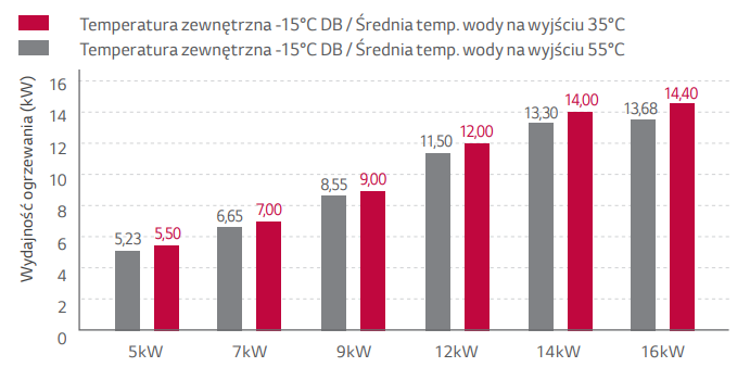 - 100% wydajności trybie grzania przy temperaturze zewnętrznej -15°C (średnia temp. wody na wyjściu 35°C , z wyjątkiem modelu o mocy 16kW)