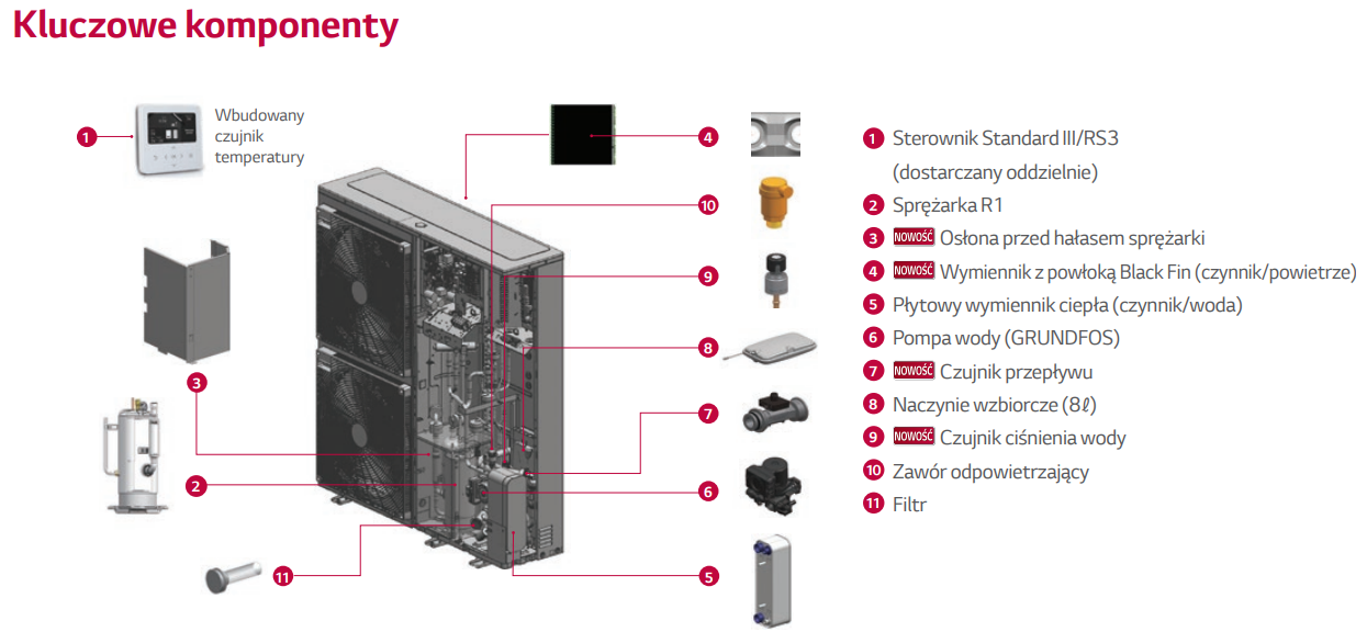 - Jednostka zewnętrzna zawiera wbudowane elementy układu wodnego: pompę wodną, czujnik przepływu, czujnik ciśnienia, naczynie wzbiorcze, zawór odpowietrzający itd.