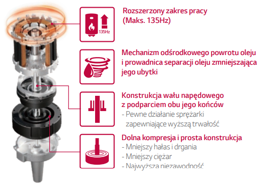 Technologia sprężarki oferuje zaawansowaną wydajność, niezawodność i zakres działania dzięki poprawionemu ruchowi przechylania się zespołu spirali.