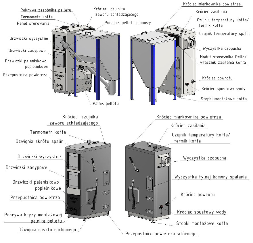 Niewielka ilość popiołu, automatyczne czyszczenie palnika, czyszczenie wymiennika tylko z przodu kotła, stopki poziomujące kocioł, łatwy demontaż zasobnika w celu transportu.