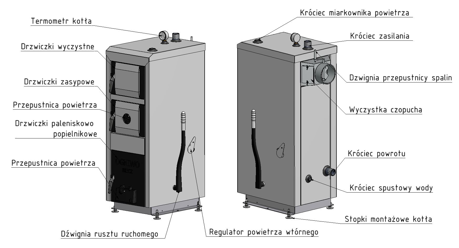 Kocioł OGNIWO CLASSIC DS został stworzony z myślą o bezpieczeństwie użytkownika oraz łatwości obsługi. Posiada mechaniczny ruszt ruchomy do odpopielania paleniska.