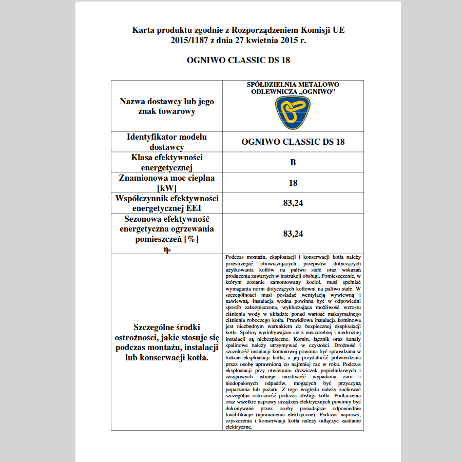 Kocioł grzewczy OGNIWO CLASSIC DS to urządzenie spełniające wymagania normy PN-EN 303-5:2021-09dla5 klasy, dyrektywy ekoprojektu, oraz programów ochrony środowiska.