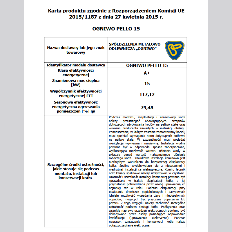 Najwyższą możliwą klasę dla kotłów spalających pellet. niska emisja zanieczyszczeń do atmosfery – kocioł spełnia wymagania 5 klasy oraz wymogi dyrektywy EKODESIGN.