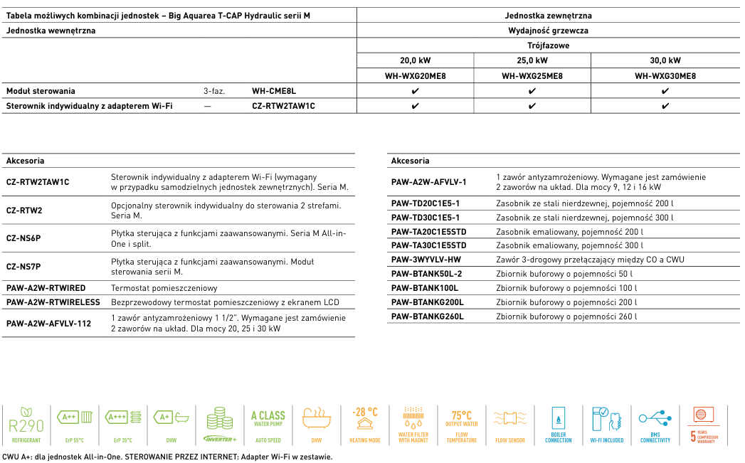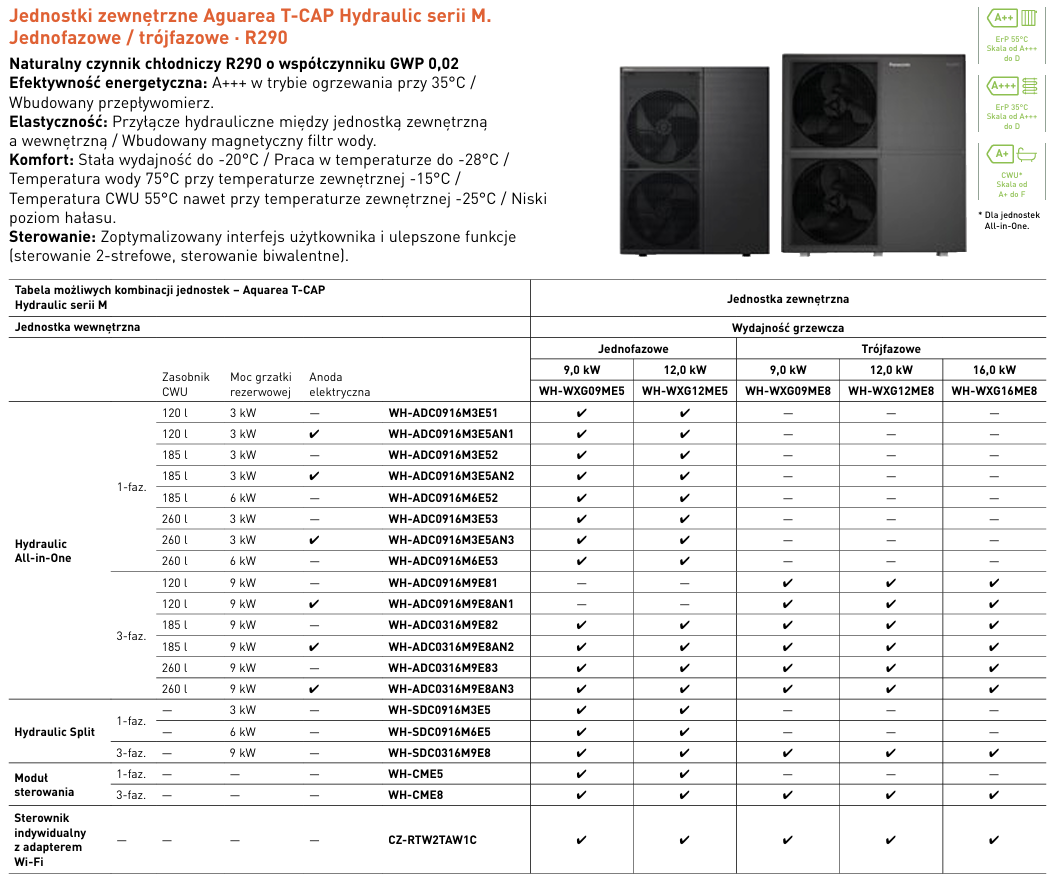Jednostki wewnętrzne Aquarea T-CAP Hydraulic serii M. Jednofazowe / trójfazowe · R290