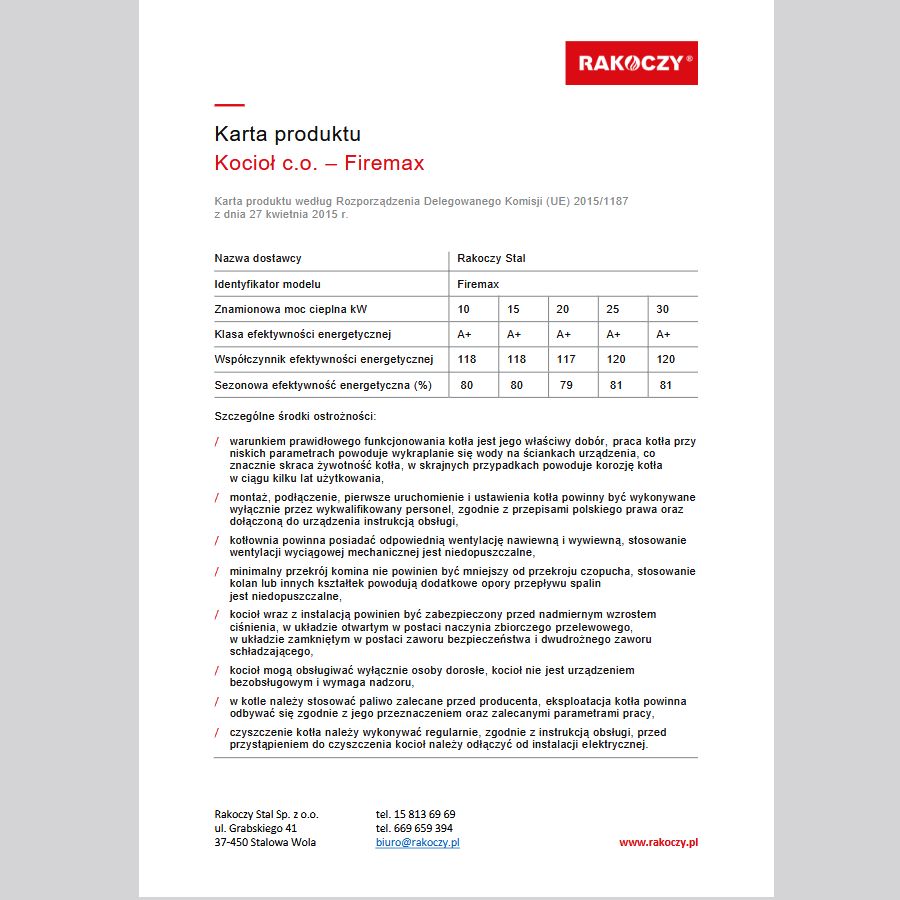 Firemax to także kocioł ekologiczny, spełniający wszystkie obecne normy emisji spalin i efektywności energetycznej, dzięki czemu może być użytkowany na obszarach, na których obowiązują restrykcyjne przepisy antysmogowe, a zakup kotła może zostać objęty dotacją z programów proekologicznych.