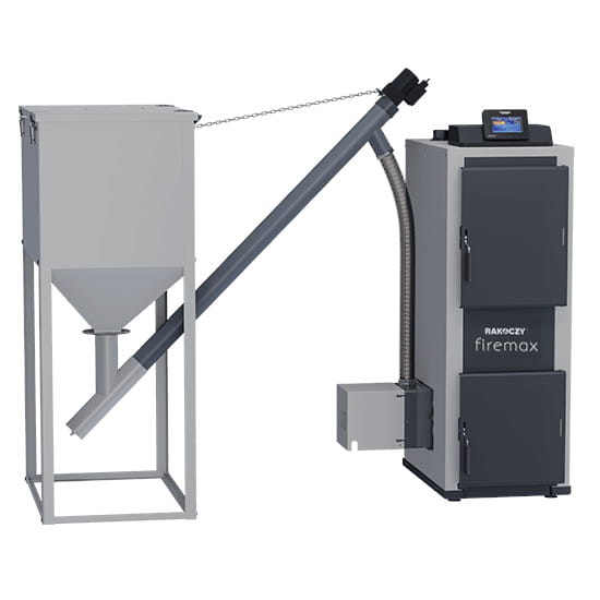 Firemax to kocioł pelletowy charakteryzujący bardzo kompaktową budową wymiennika, który wraz z podajnikiem i bardzo pojemnym zasobnikiem tworzą zwarte, niewielkie i bezobsługowe urządzenie grzewcze.