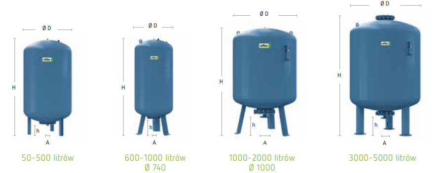 - 2-25 l: wykonanie wiszące; 33 l: z uchwytami mocującymi lub stojące; od 50 l - stojące; od Ø 1000 mm w zestawie z manometrem