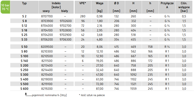 - Ciśnienie wstępne: 0,5 bar (S2); 1,5 bar (S8 - S33); 3 bar (S50 - S600)
