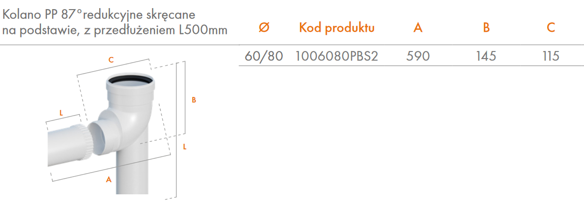 RICOM PP KOLANO REDUKCYJNE SKRĘCANE NA PODSTAWIE Z PRZEDŁUŻENIEM L500MM 87° FI 60/80 1006080PBS2