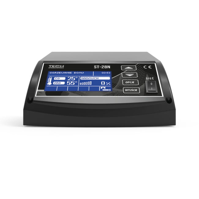 Regulator temperatury ST–28N przeznaczony jest do zasypowych kotłów CO. Steruje pompą obiegu wody, pompą ciepłej wody użytkowej CWU oraz wentylatorem. Do wyboru cztery tryby pracy pomp: ogrzewanie domu, priorytet bojlera, pompy równoległe, tryb letni. Obudowa sterownika dostosowana jest do montażu na kotle.