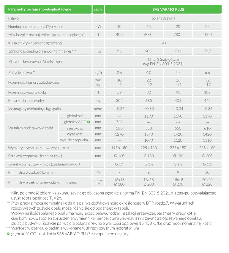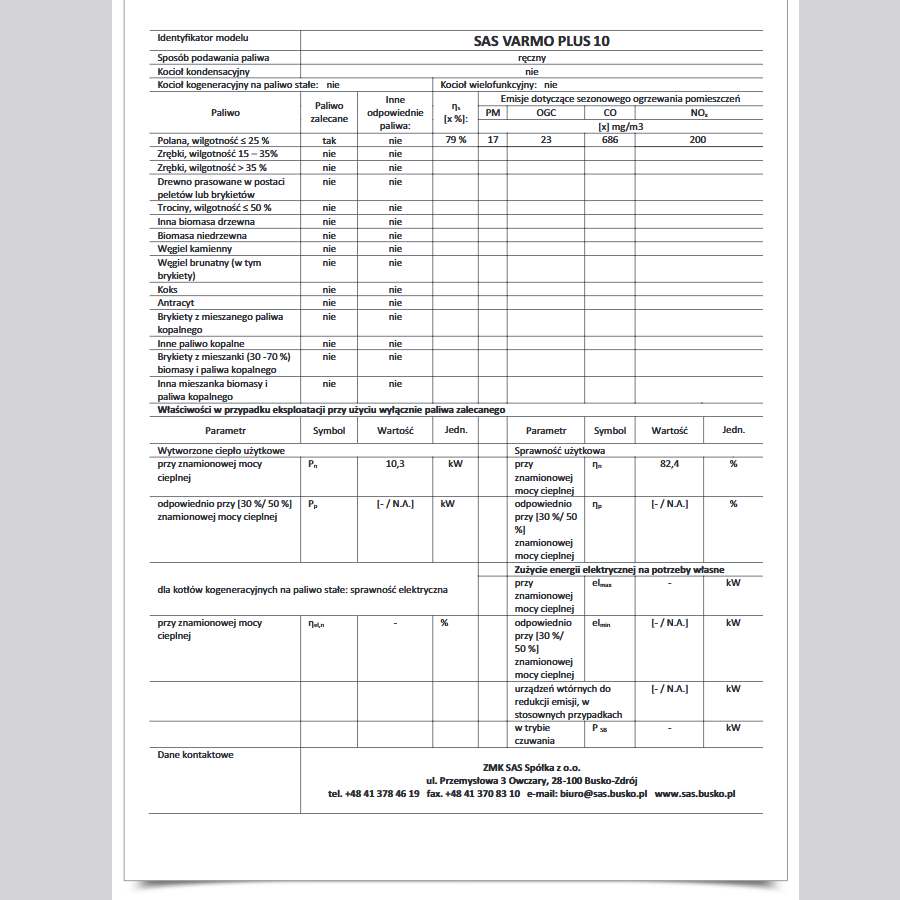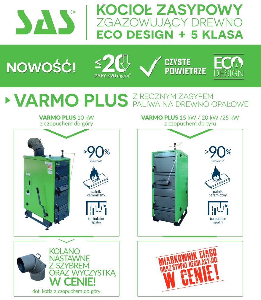 Kotły VARMO PLUS o mocy 10 kW dostępne są w wersji z czopuchem do góry. Montaż wentylatora wyciągowego możliwy jest na odcinku przewodu spalinowego pomiędzy czopuchem kotła a wlotem do komina. Ze względu na brak fabrycznego miejsca do montażu wentylatora wyciągowego bezpośrednio w czopuchu kotła ewentualną konieczność montażu urządzenia wspomagającego ciąg spalin należy przewidzieć przed zainstalowaniem kotła. W tym celu należy zweryfikować wartość wytwarzanego (istniejącego) ciągu kominowego.
