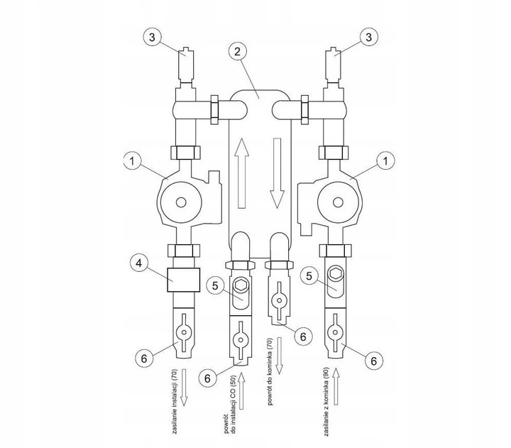 W zestawie rozróżniamy dwie strony: pierwotną (kominkowa czyli układu otwartego) oraz stronę wtórną (instalacji C.O układu zamkniętego). Integralną częścią tego układu to płytowy wymiennik ciepła. Przepływ czynnika po obu stronach musi odbywać się w układzie przeciwprądowym, natomiast parametry przepływy należy tak dobrać aby różnica temperatur oscylowała w granichach około 5 st Celsjusza.
