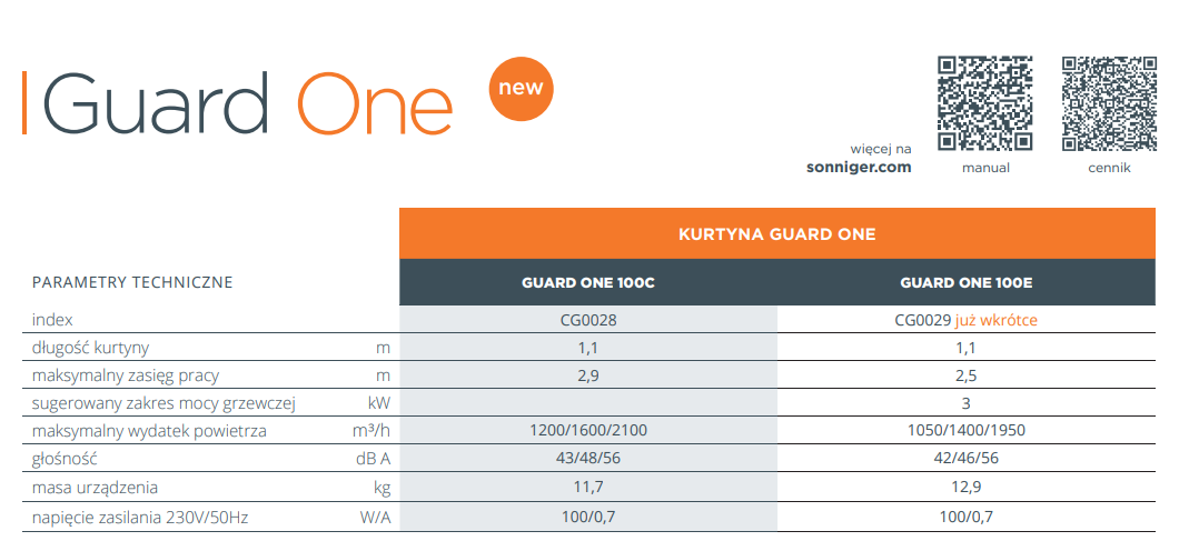 SONNIGER KOMPAKTOWA KURTYNA POWIETRZNA CIEPŁA Z GRZAŁKĄ ELEKTRYCZNĄ GUARD ONE 100E MAX 2100 M3/H CG0029