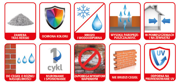 Dzięki zawartości trasu, specjalnie dobranych, wysokiej jakości kruszyw i dodatków hydrofobowych zaprawa wykazuje wysoką szczelność, co ogranicza możliwość powstawania wykwitów wapiennych oraz posiada bardzo dużą odporność na działanie czynników atmosferycznych i zmiennych cyklów zamrażania i odmrażania.