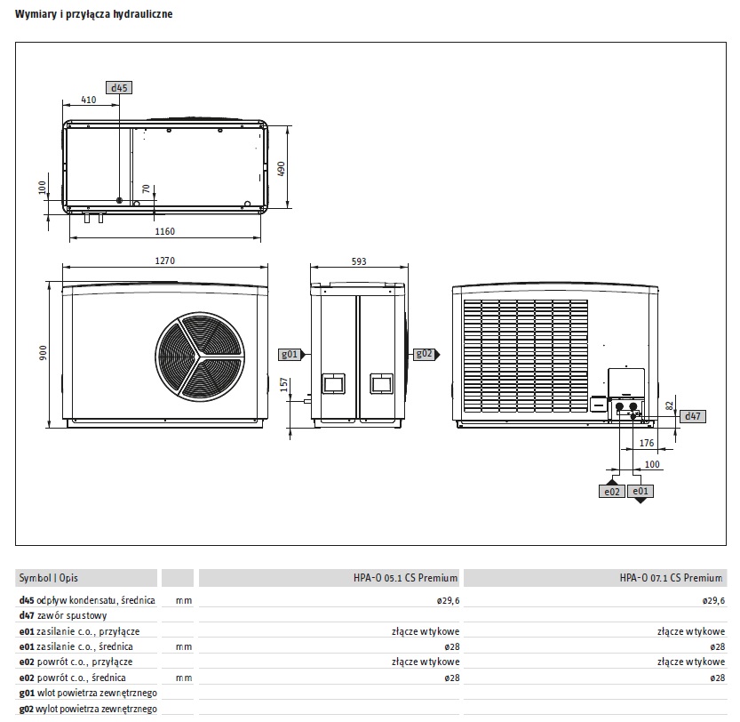 Zintegrowane kompensatory drgań umożliwiają bezpośrednie podłączenie do systemu grzewczego. Obracany panel przyłączy elektrycznych ułatwia dostęp z każdej strony. Szybki dostęp do tacy kondensatu możliwy jest przez otwór rewizyjny z tyłu. Metalowa obudowa wykonana z cynkowanej ogniowo i lakierowanej proszkowo blachy stalowej, zabezpieczona jest przed korozją oraz pokryta lakierem piecowym w kolorze białym. Kratki wentylacyjne, uchwyty i pokrywa wykonane są z tworzywa sztucznego odpornego na działanie czynników atmosferycznych i promieniowanie UV, w kolorze srebrno-białym.