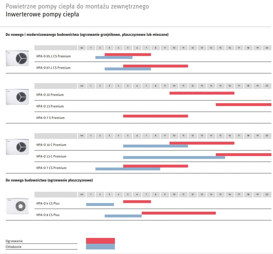 - Modulacja mocy: sprężarka inwerterowa (o regulowanej prędkości obrotowej) pozwala na optymalne dopasowanie mocy do aktualnego zapotrzebowania obiektu