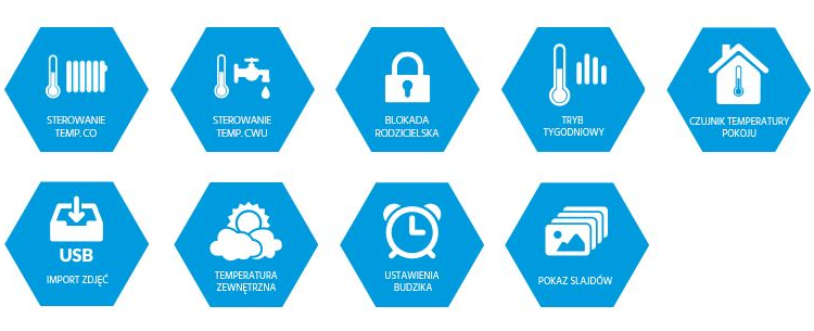 - sterowanie temperaturą zaworów mieszających (dostępne przy współpracy z modułem zaworu)