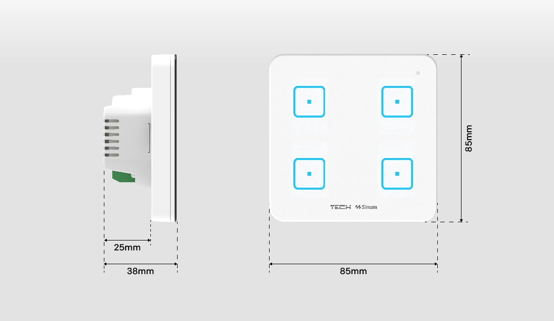 Urządzenia szklane serii Single zostały zaprojektowane w sposób kompaktowy, aby idealnie pasowały do pojedynczego frontu szklanego. Dzięki precyzyjnie dobranym wymiarom, urządzenia doskonale mieszczą się w standardowych puszkach montażowych, co zapewnia estetyczne wykończenie i idealne dopasowanie.