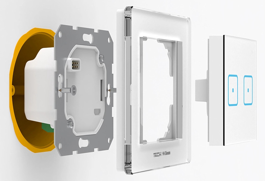 Szklane ramki umożliwiają konfigurowanie paneli włączników oraz montaż urządzeń w standardowych puszkach o średnicy 60 mm, zarówno w układzie poziomym, jak i pionowym. Dzięki nim można dowolnie konfigurować włączniki światła, regulatory pokojowe czy włączniki do rolet, dostosowując instalację do indywidualnych potrzeb i preferencji użytkownika. System ten zapewnia elastyczność i estetykę, łącząc nowoczesny design z funkcjonalnością.