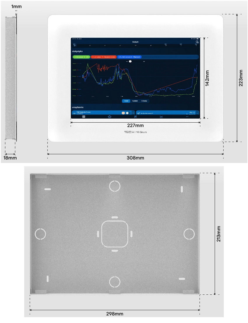 Ramka FT-01i została zaprojektowana z myślą o estetycznym i dyskretnym montażu tabletu Apple iPad 10,2” w ścianie. Metalowa obudowa ramki wymaga wykonania wnęki o wymiarach 308 × 223 × 18 mm, co pozwala na jej całkowite ukrycie w tynku.