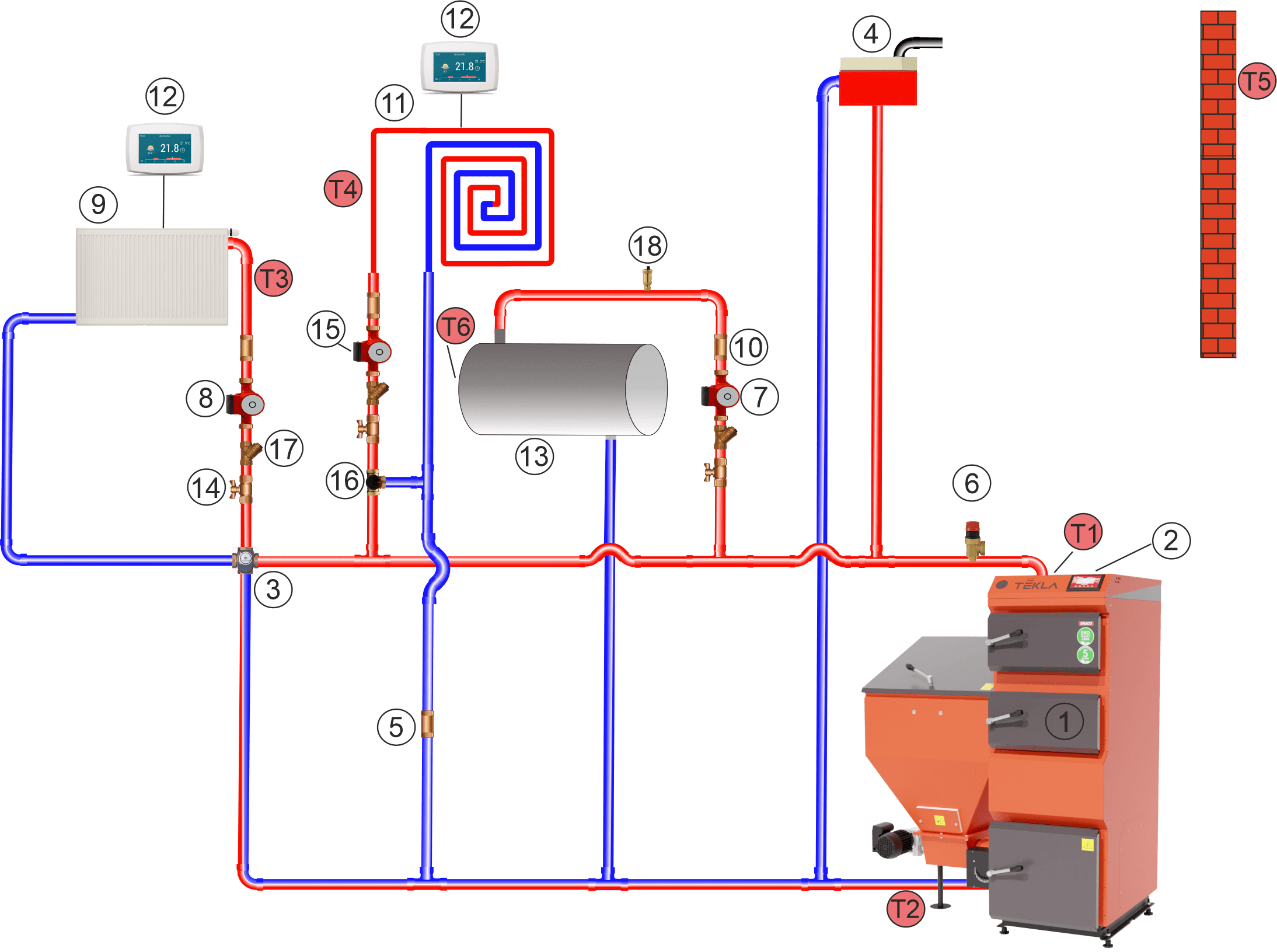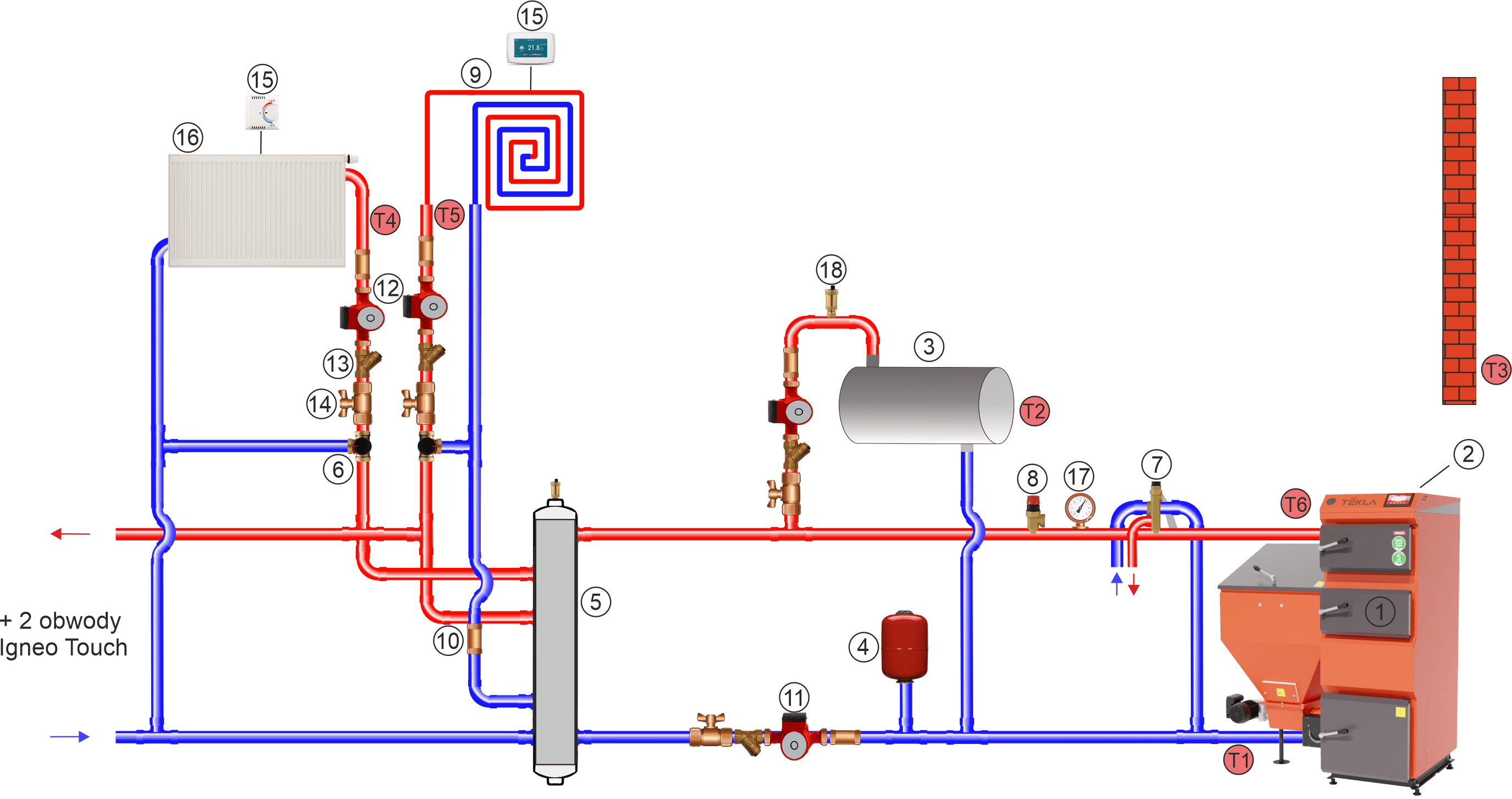 1 - Kocioł, 2 - Sterownik kotła, 3 - Zbiornik c.w.u., 4 - Naczynie wzbiorcze zamknięte, 5 - Sprzęgło hydrauliczne, 6 - Zawór mieszający trzydrogowy z siłownikiem, 7 - Zawór DBV, 8 - Zawór bezpieczeństwa 1,5 bar, 9 - Ogrzewanie c.o. 2, 10 – Zawór zwrotny, 11 – Pompa ładująca, 12 - Pompa c.o., 13 - Filtr, 14 - Zawór, 15 - Czujnik pokojowy, 16 - Ogrzewanie c.o. 1, 17 - Manometr, 18 - Odpowietrznik automatyczny, T1 - Czujnik temp. powrotu, T2 - Czujnik temp. c.w.u T3 - Czujnik temp. zewnętrznej, T4 - Czujnik temp. c.o. 1, T5 - Czujnik temp. c.o. 2, T6 - Czujnik temp. kotła.
