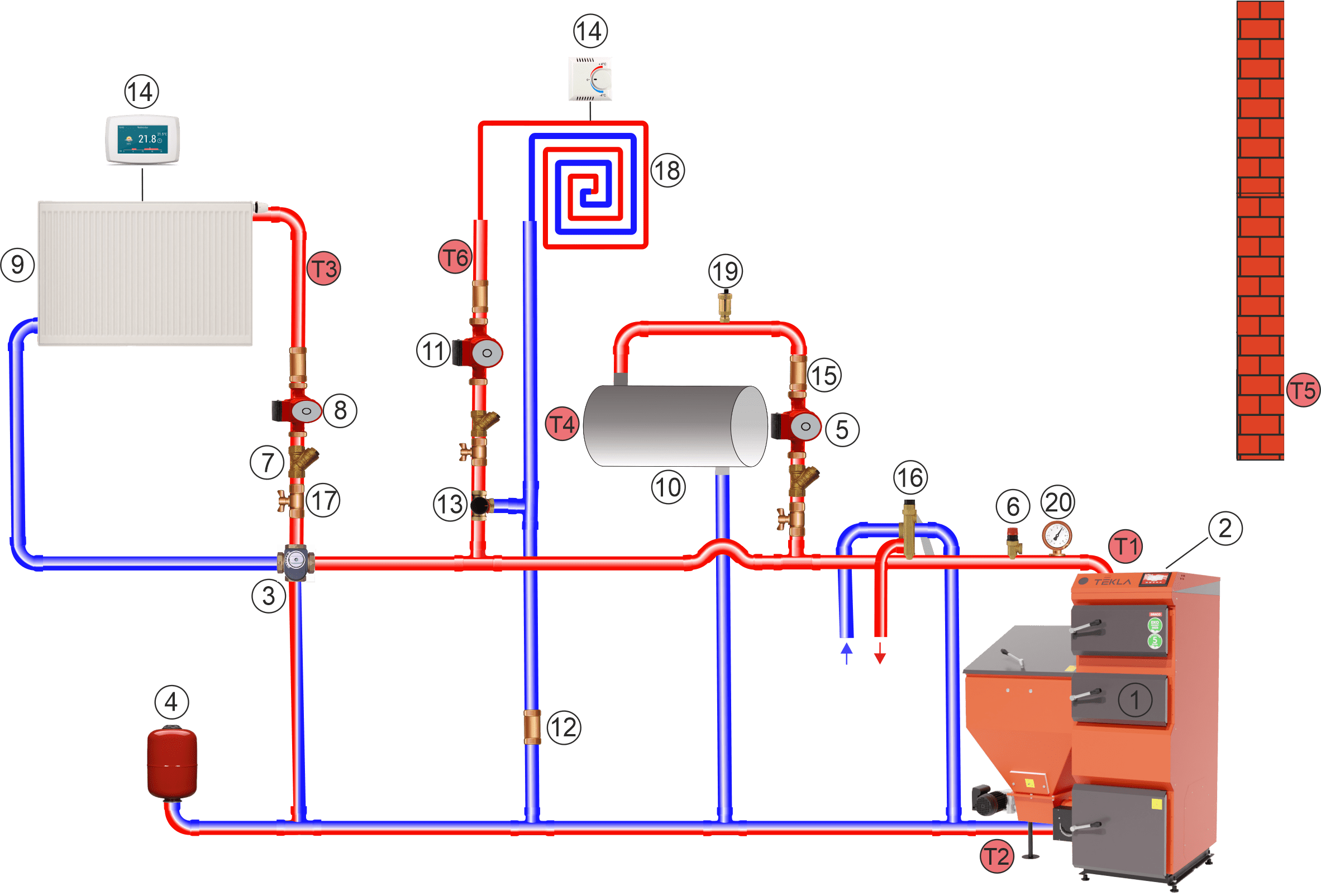 1 - Kocioł, 2 - Sterownik kotła, 3 - Zawór mieszający czterodrogowy z siłownikiem, 4 - Naczynie wzbiorcze zamknięte, 5 - Pompa c.w.u., 6 - Zawór bezpieczeństwa 1,5 bar, 7 - Filtr, 8 - Pompa c.o. 1, 9 - Ogrzewanie c.o. 1, 10 - Zbiornik c.w.u., 11 - Pompa c.o. 2, 12 – Zawór zwrotny, 13 - Zawór mieszający trzydrogowy z siłownikiem, 14 - Czujnik pokojowy, 15 - Zawór zwrotny, 16 - Zawór DBV-1, 17- Zawór, 18 - Ogrzewanie c.o. 2, 19 - Odpowietrznik automatyczny, 20 - Manometr, T1 - Czujnik temp. kotła, T2 - Czujnik temp. powrotu, T3 - Czujnik temp. c.o. 1, T4 - Czujnik temp. c.w.u., T5 - Czujnik temp. zewnętrznej, T6 - Czujnik temp c.o. 2,
