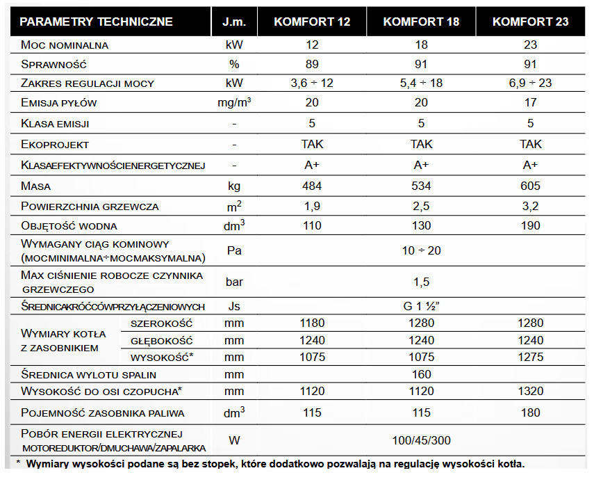 Seria autorskich, automatycznych kotłów KOMFORT powstała z myślą o minimalizacji koniecznej obsługi kotła przez użytkownika. Standardowo kocioł wyposażony jest w automatyczne odpopielanie oraz czyszczenie wymiennika, realizowane z odpowiednim interwałem w zależności od stopnia zanieczyszczenia. Niewielkie gabaryty, w szczególności jego wysokość oraz wyjście spalin w górnej części kotła, daje szereg możliwości zainstalowania go nawet w małej kotłowni, a obsługa zostaje ograniczona do minimum.